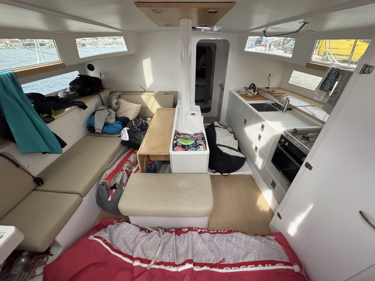 We’re split across two boats: Apollo 1 and Apollo 2. Both are identical Pogo 44s – the “luxury” version of the Pogo, so to speak. The interior is actually quite sleek, though once you pack six sailors and all their gear on board, you don’t see much of that “nice decor” anymore. She’s a beauty, for sure, but is she fast? We’re about to find out.