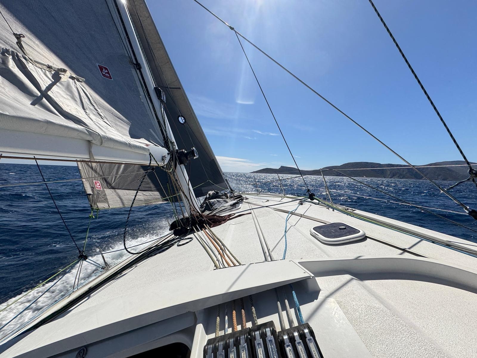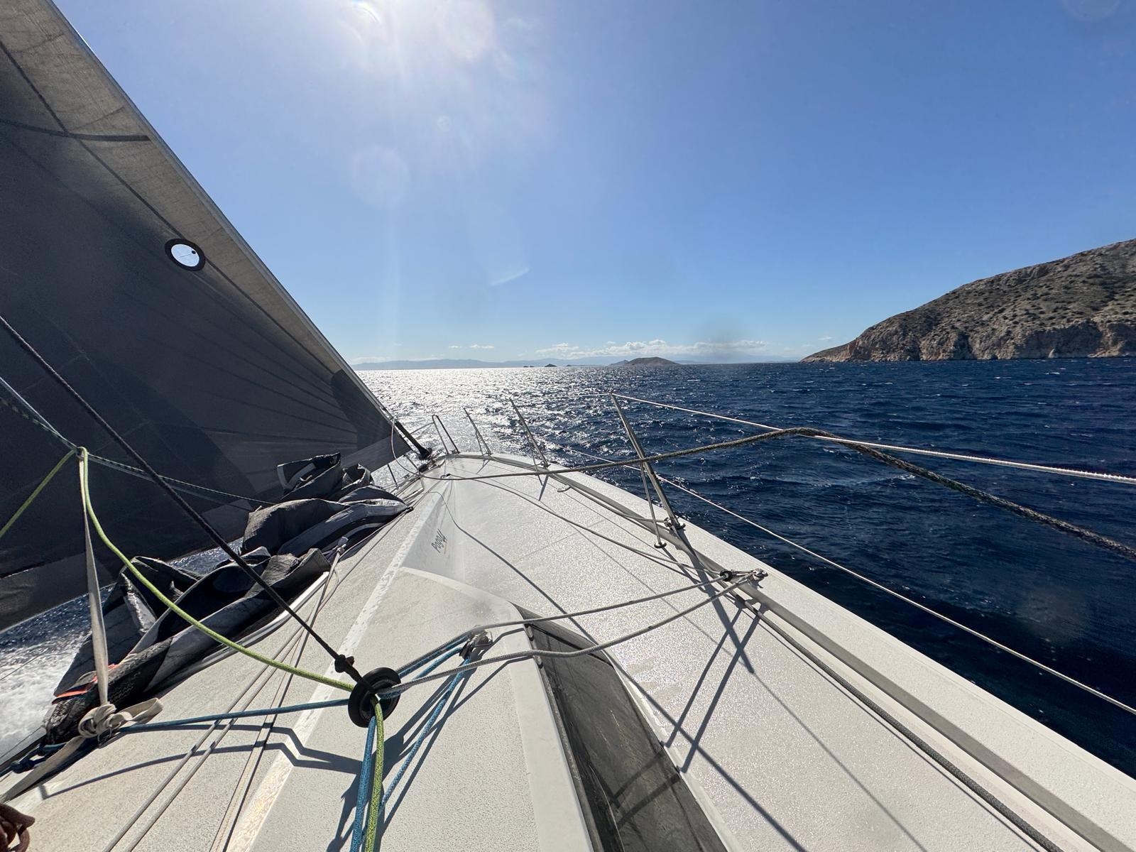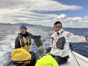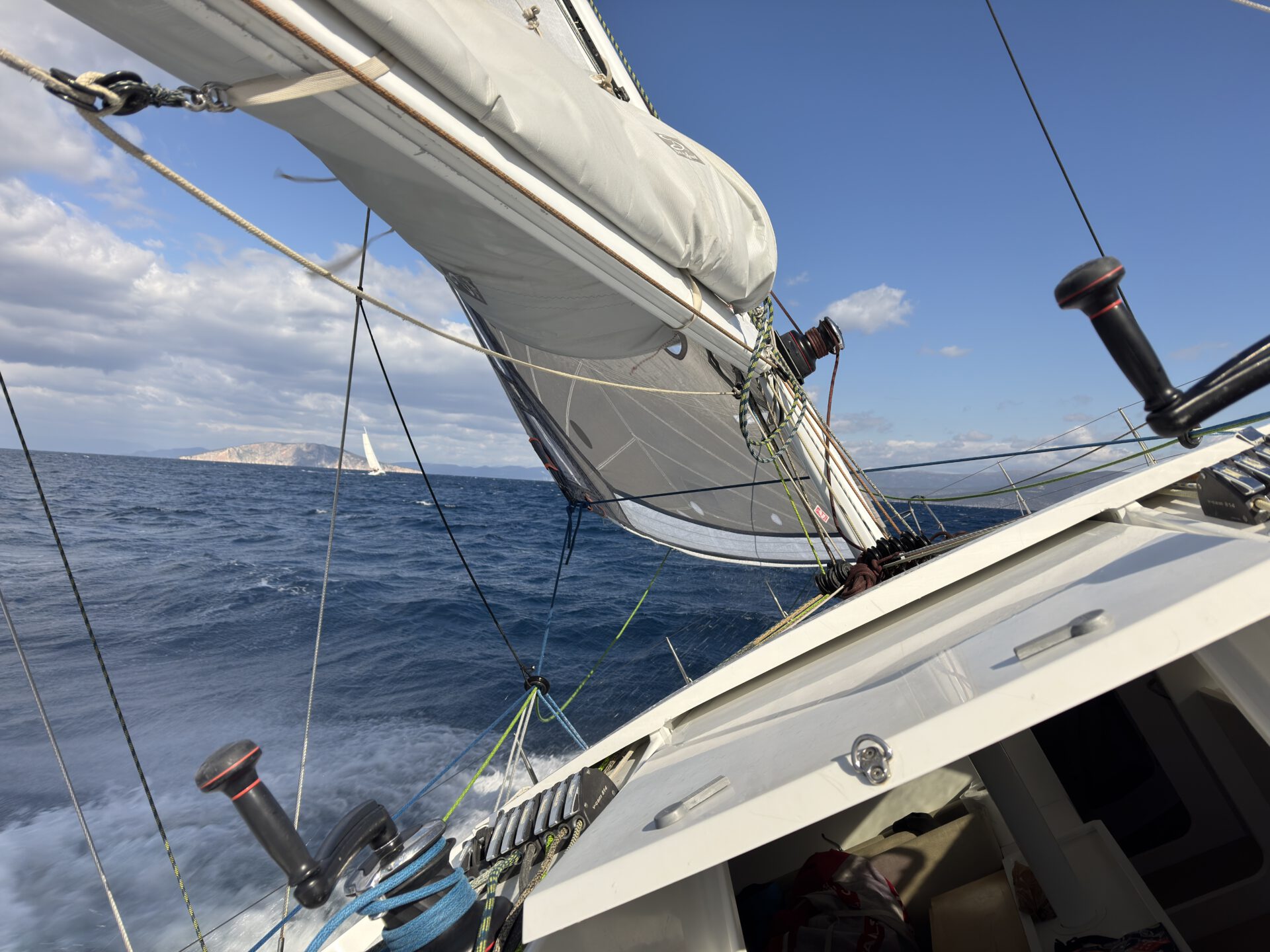 We left Ermioni in the morning with a forecast of 8 knots, supposed to ramp up to 20 by noon. The wind didn’t wait and hit us by 10 AM. I spent four hours straight at the helm under the gennaker, fully focused on squeezing every bit of power out of that 200 m² sheet of nylon. The wind eventually climbed toward 35 knots, but luckily, we already had the gennaker down by then. The weather closed in, and the temperature took a dive. We were planing under jib and main until just before our destination, and everyone was visibly relieved to reach port given the freezing temps. Again the Fastsailing.gr Train & Race was e perfect choice for me.